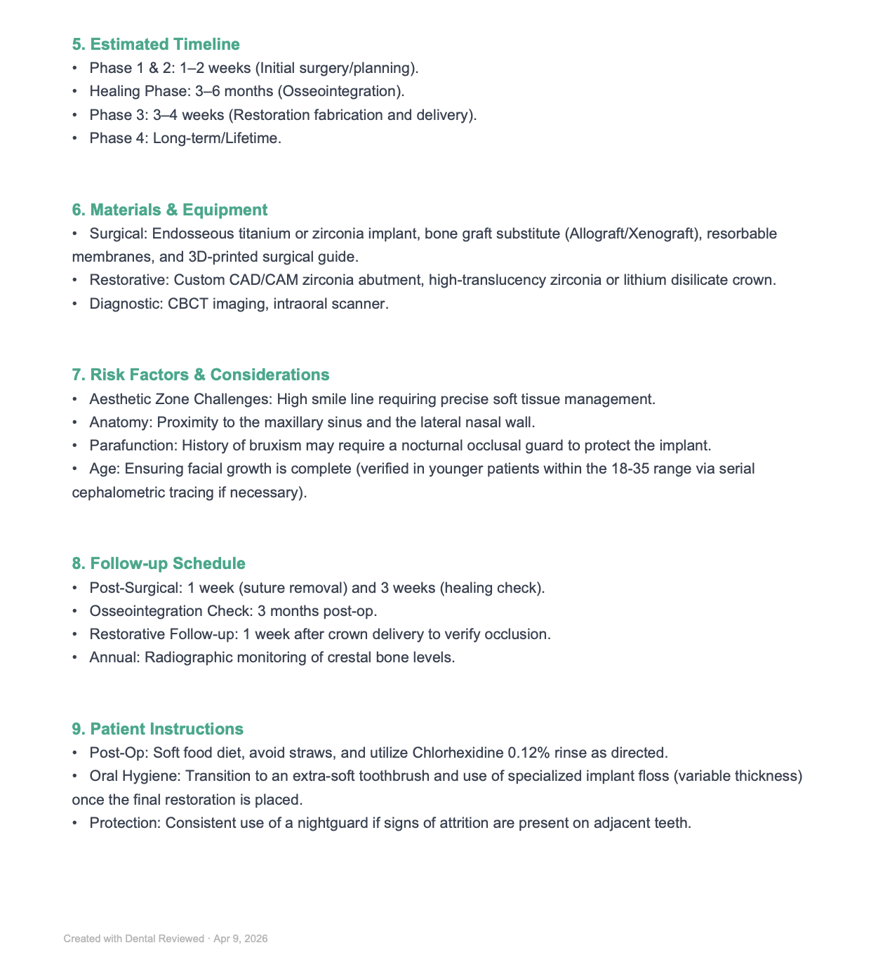 Keep in mind that this example is based on a fictional treatment plan generated for illustration. Actual plans will differ based on clinical findings, the implant system used, patient-specific anatomy, and practitioner protocols. Every treatment plan should be reviewed by a dental professional before implementation, taking into account the individual patient's condition, comorbidities, drug interactions, and other clinically relevant factors.